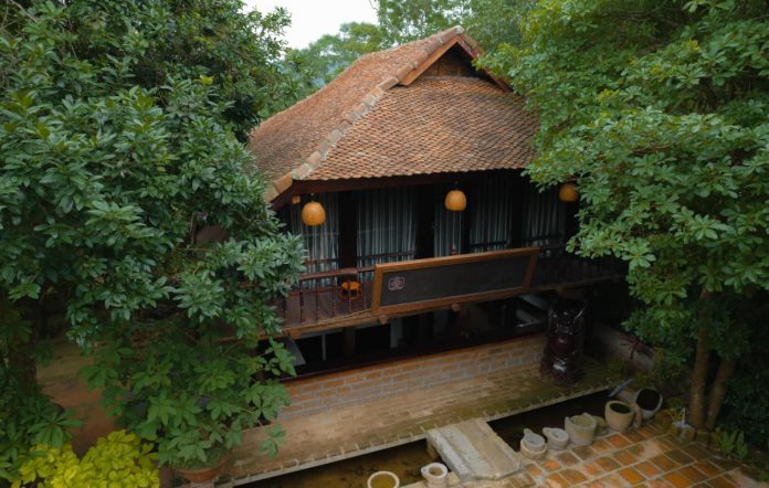 Tomodachi Retreat Làng Mít là homestay nghỉ dưỡng ở thôn Trại Láng, xã Cổ Đông, Sơn Tây. Ở đây có 30 phòng nghỉ được bao bọc bởi không gian xanh của vườn cây trái làng quê, hồ Láng Hầu. Vì vậy, khu nghỉ có không khí thoáng đãng, trong lành. Các dãy nhà được xây theo hình uốn cong cánh diều và kênh lên khỏi mặt đất để tránh côn trùng, mối mọt và ẩm thấp của miền Bắc. Ảnh: Tomodachi Làng Mít
